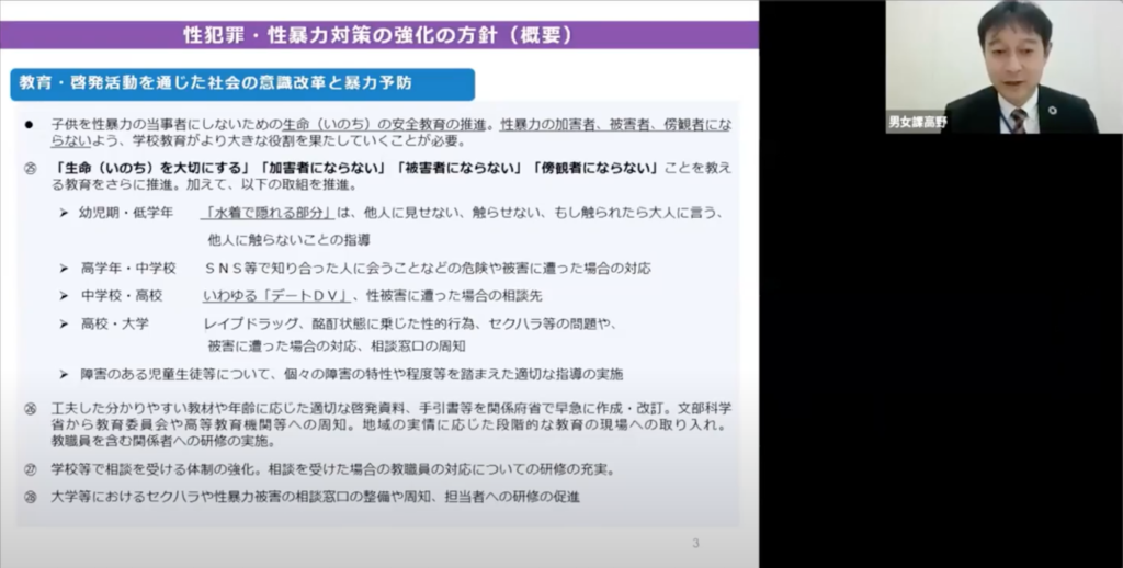 」と定め、被害の相談をしやすい環境整備や、性暴力予防のための広報・啓発活動などに取り組んでいる。この「強化の方針」では国の施策として初めて「デートDV」の文言が盛り込まれ、恋人間の暴力が社会的な問題だと認識された。啓発・教育の一環としては「生命(いのち)の安全教育」の推進を掲げている。子どもを性暴力の当事者にしないために、中学校・高校の段階で学校教育の中でデートDVや性暴力についての学習を盛り込むという。
