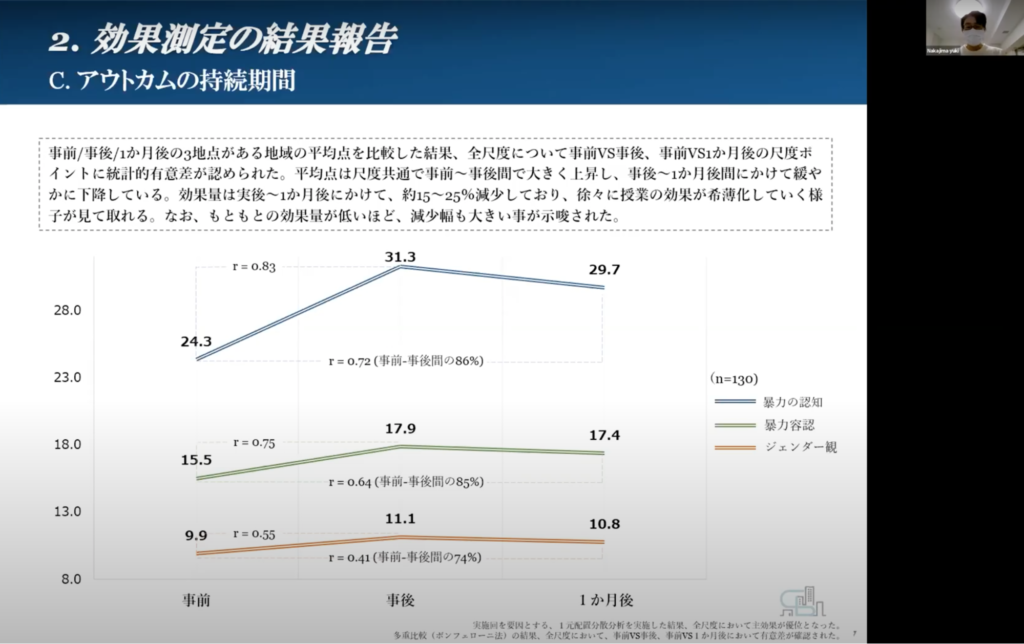結果は3点すべてに関して授業前よりも授業後にポジティブな変化が見て取れた。変化の度合いとしては、暴力の認知がもっとも変化が大きく、次に暴力の許容、もっとも変化が小さかったのはジェンダー観だった。