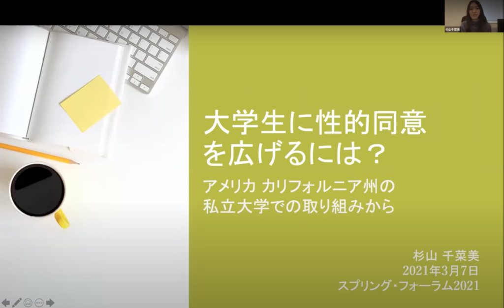 一人目の登壇者は現在社会人として働きながら、性の健康教育を広げる「NPO法人ピルコン」でフェローとして活動している杉山千菜美さん。大学生時代の留学先であるアメリカカリフォルニア州の大学で性的同意ワークショップを行った際の経験をシェアした。