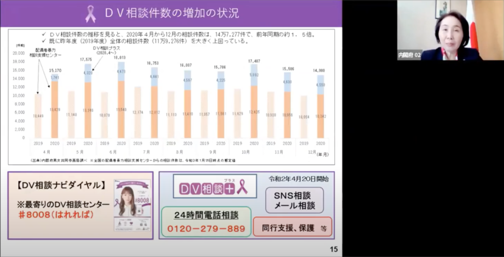 コロナ禍に入ってからのDV相談件数は顕著に増えていて、2020年4月〜12月の相談件数は14万7,277件で前年同期比1.5倍だったという。こうした現状を踏まえ、内閣府では昨年6月に「性犯罪・性暴⼒対策の強化の⽅針(概要)」を策定し、令和2年度〜4年度の3年間を「性犯罪・性暴⼒対策の『集中強化期間』
