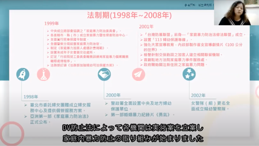 台北市や高雄市では80年代末期から家庭内暴力防止活動を始め、女性福祉サービスセンターを運営していたという。台湾社会がDV問題により積極的に取り組むようになったのは、1993年に起きたDV被害者女性が加害者である夫を殺害した事件がきっかけだった。