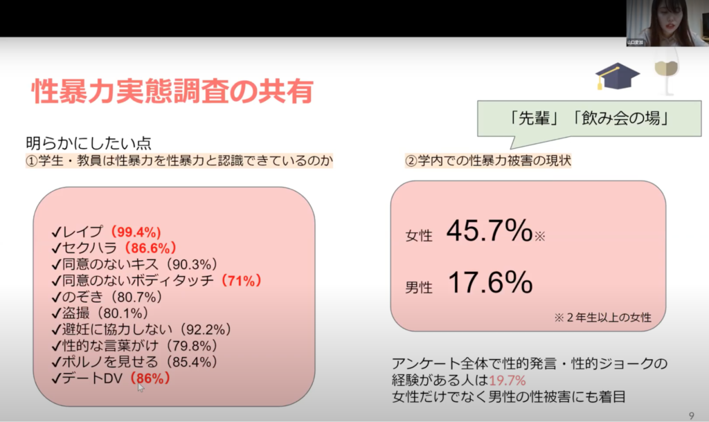 昨年2020年の9〜10月に、学内の学生と職員および卒業生を対象に性暴力の実態に関する調査を行った。調査の中で、性暴力を性暴力と認識できているかを問う質問では、「セクハラ(性暴力と認識している割合が86.6%)」「デートDV(同86%)」「同意のないボディタッチ(同71%)」など、性暴力であるにも関わらず、それを自覚していない人が少なくないことがわかった。