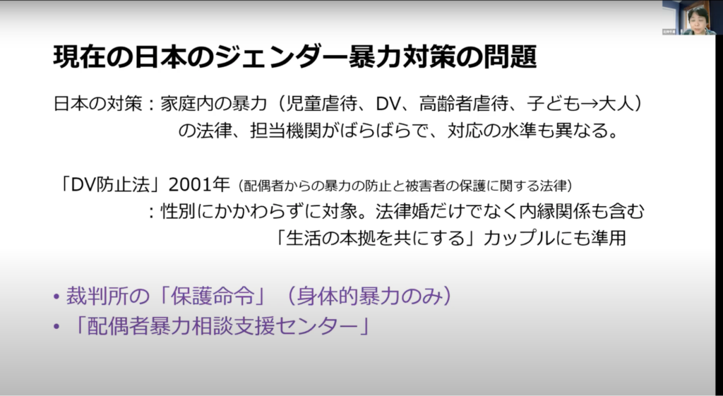 また、ジェンダー暴力は決して特別なものではなく、社会に蔓延しているものだ。ジェンダー暴力の被害者は世界中に10億人以上いるだろうと言われていて、海外ではその10億人がともに立ち上がろうと呼びかける「One billion rising」というムーブメントも起こっている。しかし、日本のジェンダー暴力に対する対策は、台湾や韓国などジェンダー暴力対策の先進国に比べ、まだまだ不十分であると指摘。DV防止法の適応対象が婚姻関係か内縁関係、または同居のカップルにだけに限定されている上、裁判所の保護命令も時間のかかる「通常保護命令」でおもに身体的暴力のケースにしか発令されないことを例に上げた。